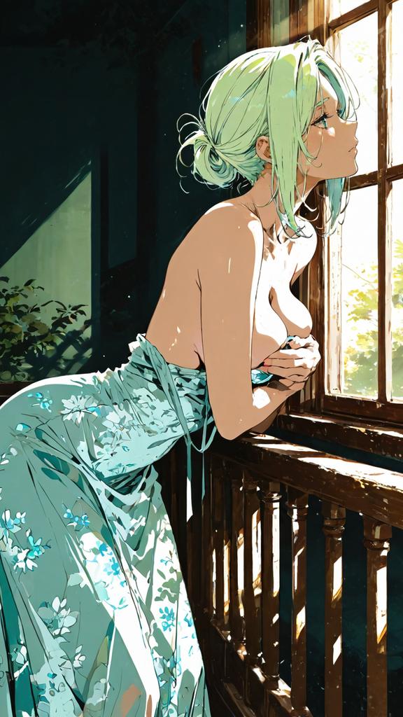窓の向こうで午後が薄くほどけ、青いドレスの裾が静かに呼吸する。
