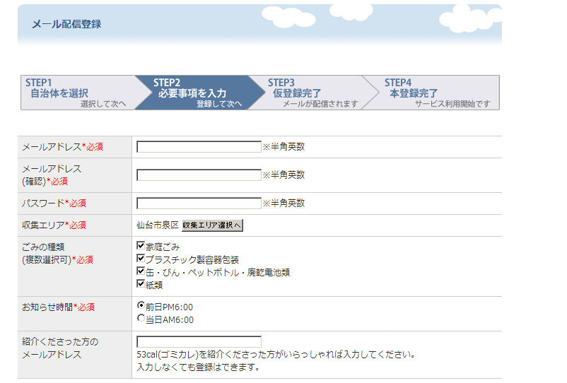 使い方は簡単で、トップ画面から「メール配信登録」を選んで、メアドやパス、収集エリア、ごみの種類を選択、登録するだけです。