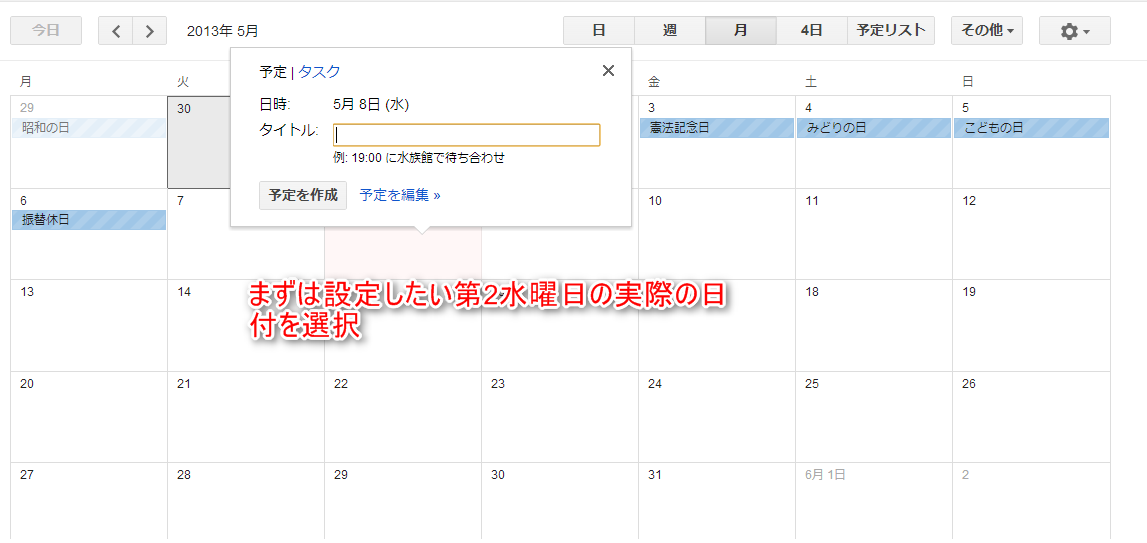 (ここでは2013年5月8日(第2水曜日)の設定から入ります)