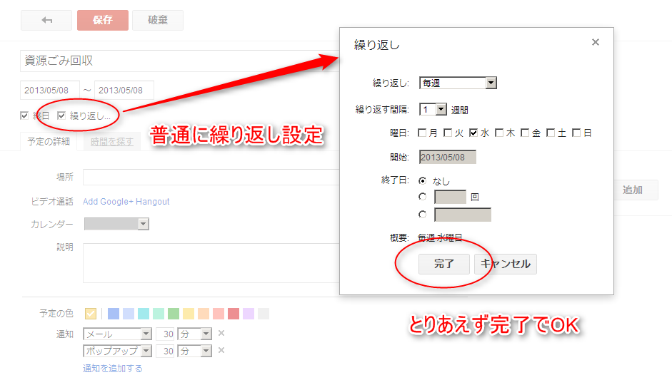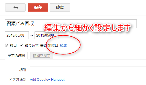 ごみ収集日はいったん調べてしまえば、それほどコロコロ変わるものでもないので、Googleカレンダーで繰り返し表示を設定してしまう、という手もあります。