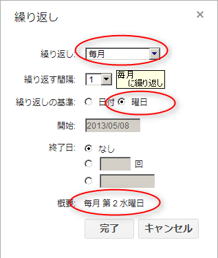 すると、さきほどの繰り返し編集とは別の繰り返し設定が出てきます。ここで繰り返しのパターンをプルダウンで「毎月」を選び、繰り返し基準を「曜日」と選択します。これで概要に「毎月 第2 水曜日」と表示されました! 後は5月27日に1~4の繰り返しで「毎月 第4 水曜日」を設定すれば、完成です! やった!