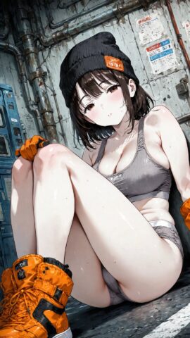 灰色トップスに橙の手袋、無言のコントラスト