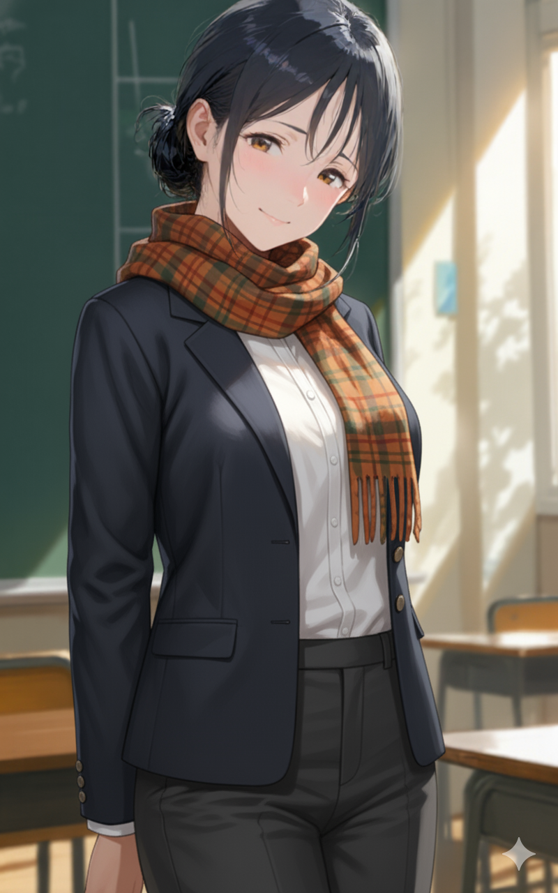 黒板とマフラー、冬の教室に灯る約束の笑み チョークの粉が薄く舞い、彼女のスーツの肩に淡く降りた。マフラーの温もりだけが、冬の教室に残る吐息をやわらげる。黒板に描かれた数式よりも、静かな眼差しの余白が気になってしまう。言葉は丁寧で、間はやさしく、鐘の音を待つ時間さえひそやかに艶めく。授業が終わると、彼女はマフラーを整え、笑って言った。「続きは、明日。」その約束が、寒さより先に胸を温めた。黒板の端に残る白い線を、彼女は指先でそっと払い落とす。その仕草ひとつで、凍てつく廊下まで柔らかくなる気がした。 #スーツ#マフラー#冬#教室#清楚#知的#美人教師#黒板