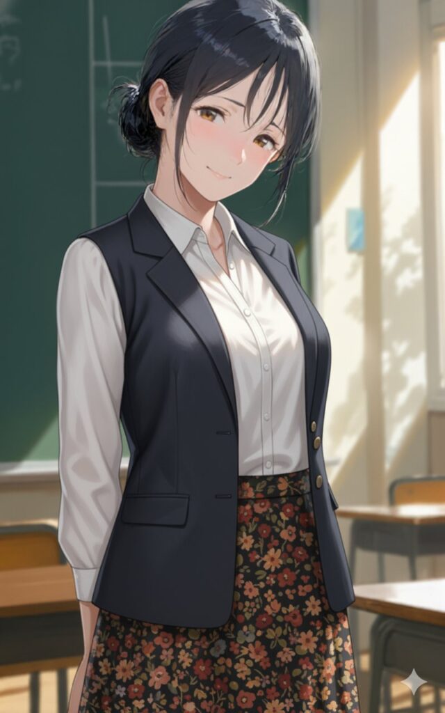 黒板の前、白い粉が微かに舞い、午後の光が肩口を温める。