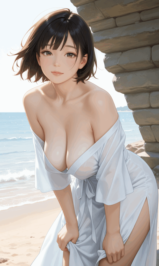 白ワンピの彼女、渚で夏の光にほどけてゆく